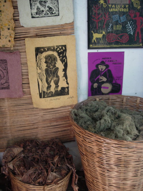 Natural materials such as moss and coconut husks, with samples of some of the woodblock prints on handmade paper.