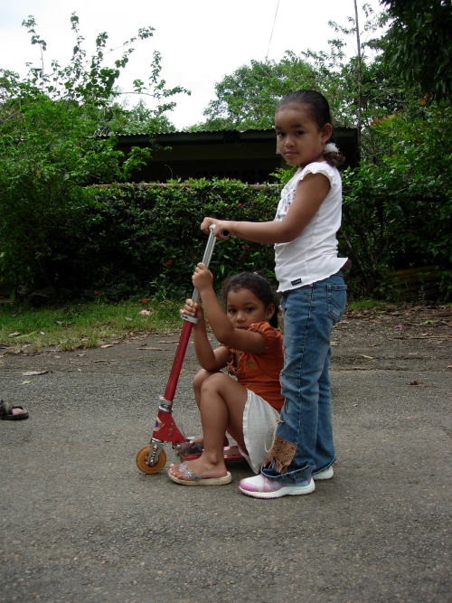 Two girls on a razor scooter in Sona