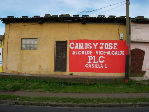 In many towns, the telephone poles are painted the colors of the party that is most popular there: red and black for the FSLN, bright red for the PLC.
