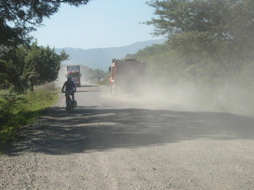 Erin, trucks and dust on the main road to Somotillo, Nicaragua.