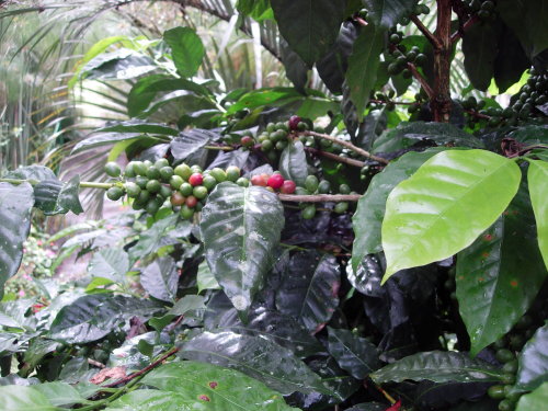 This is a coffee plant in Panama. The beans are green, and then when they are ripe they turn a bright red.