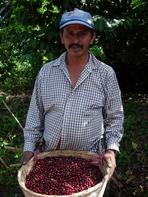 A coffee cutter in El Salvador. Cutters are paid for each sack of coffee that they pick - the beans that they pick must be red (ripe) or else the worker will not be paid.