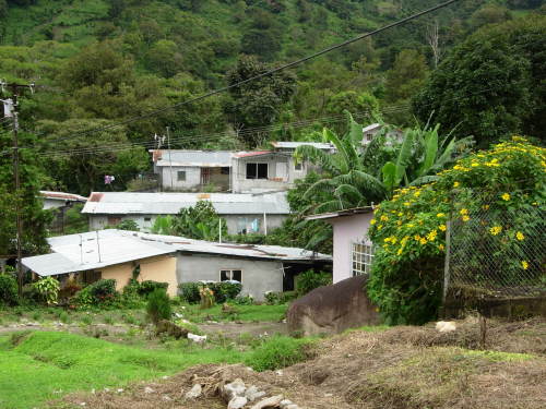 In Boquete, Panama, these houses are on the edge of a large national park. The hillsides are very steep and the climate is cool. Notice the roofing materials - very common all over Central America and Mexico.