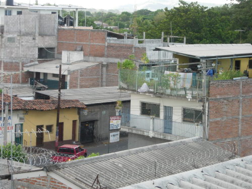 Housing in the city of San Miguel, El Salvador. Most houses have large walls and a gate facing the street, then a spacious, protected courtyard in the middle.