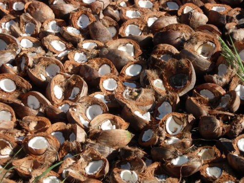 Old coconuts drying in the sun, before the meat is scraped out of them.