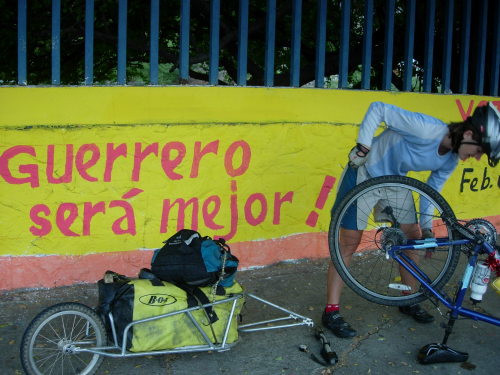 Erin changes her tire on the side of the road in the state of Guerrero, Mexico.