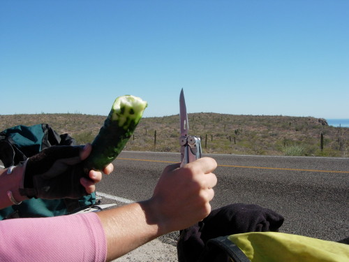 Two more important items - a fresh cucumber snack and Leatherman, the all-purpose tool.