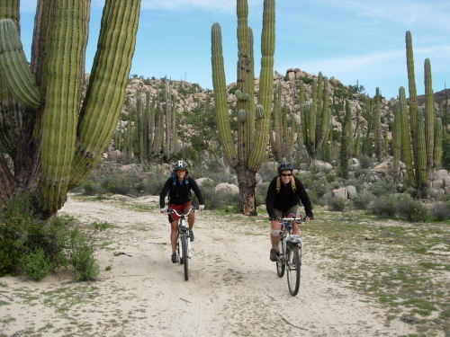 Erin and Marin biking between Cardon cactus. These cactus are the largest cactus in the world growing up to 20 meters (65 feet) tall. They live about 200 years and their lumber is often used for building purposes, especially furniture.